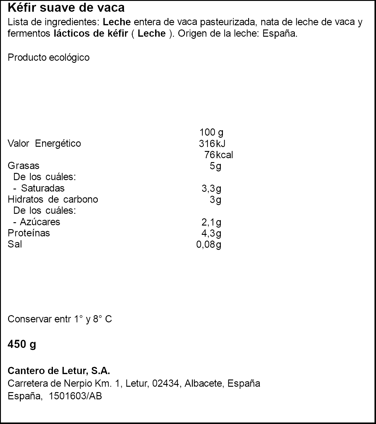 CANTERO DE LETUR KÉFIR SUAU VACA 450GR