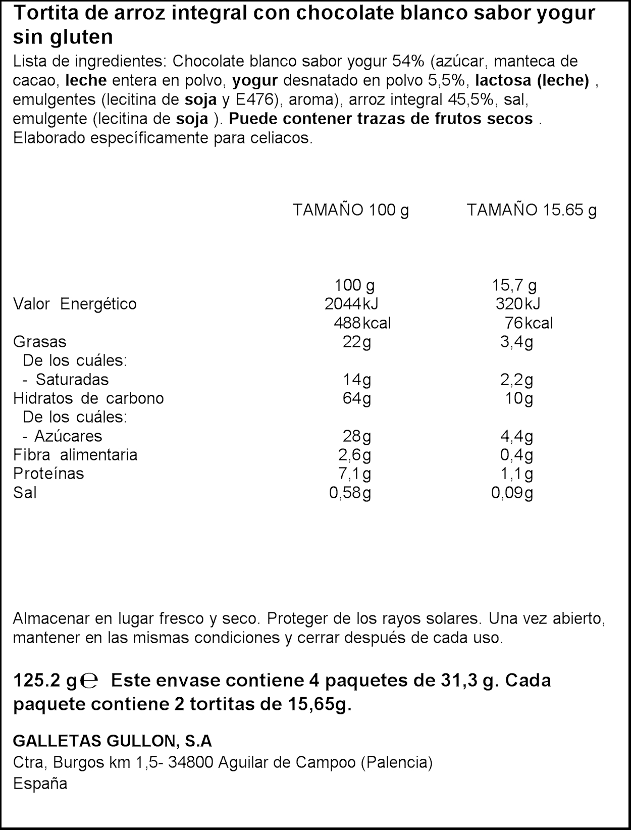 GULLON TORTITAS DE ARROS/IOGURT 125GR