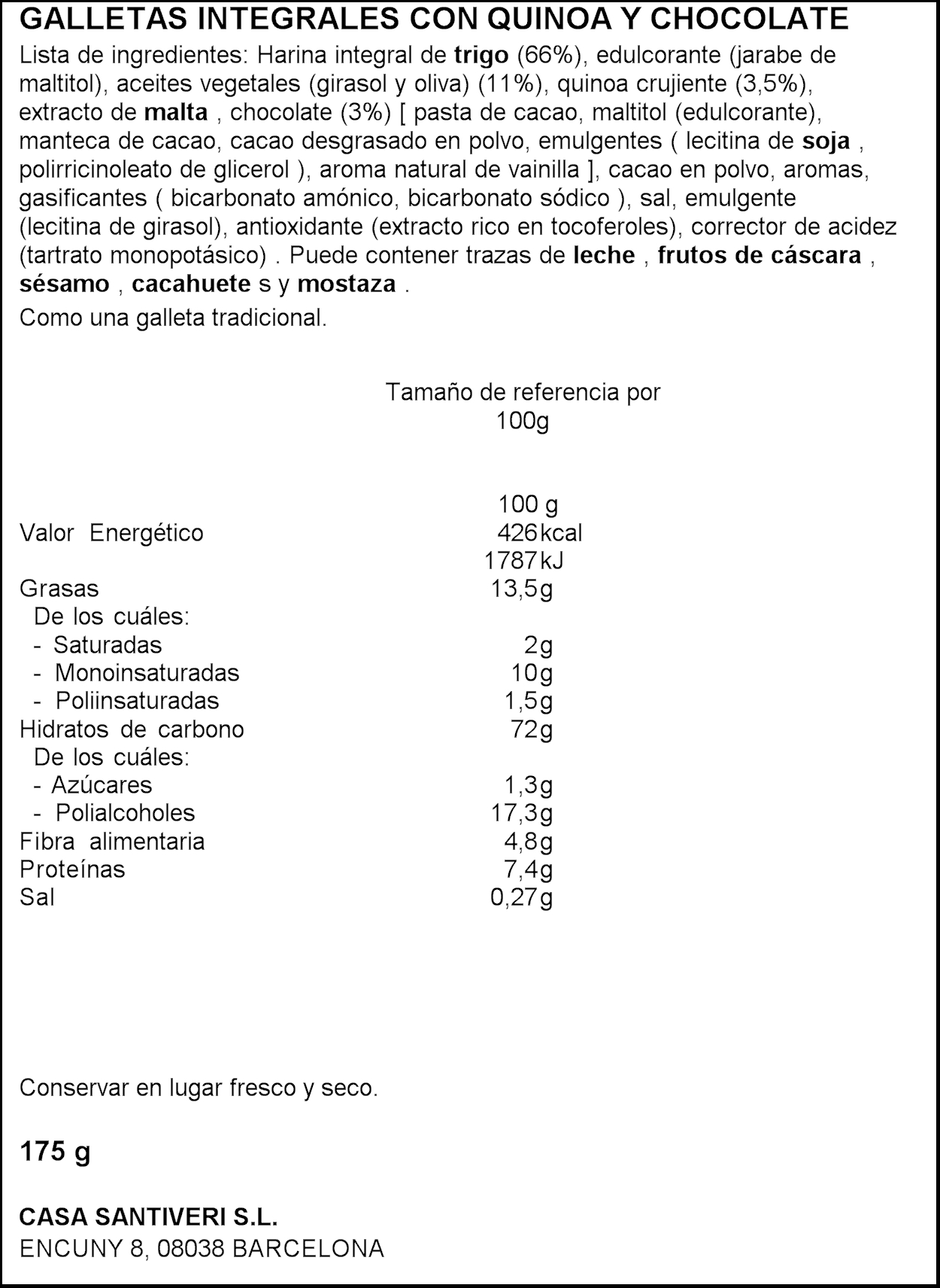 SANTIVERI GALETES DIGESTIVE QUINOA/XOCO 175GR