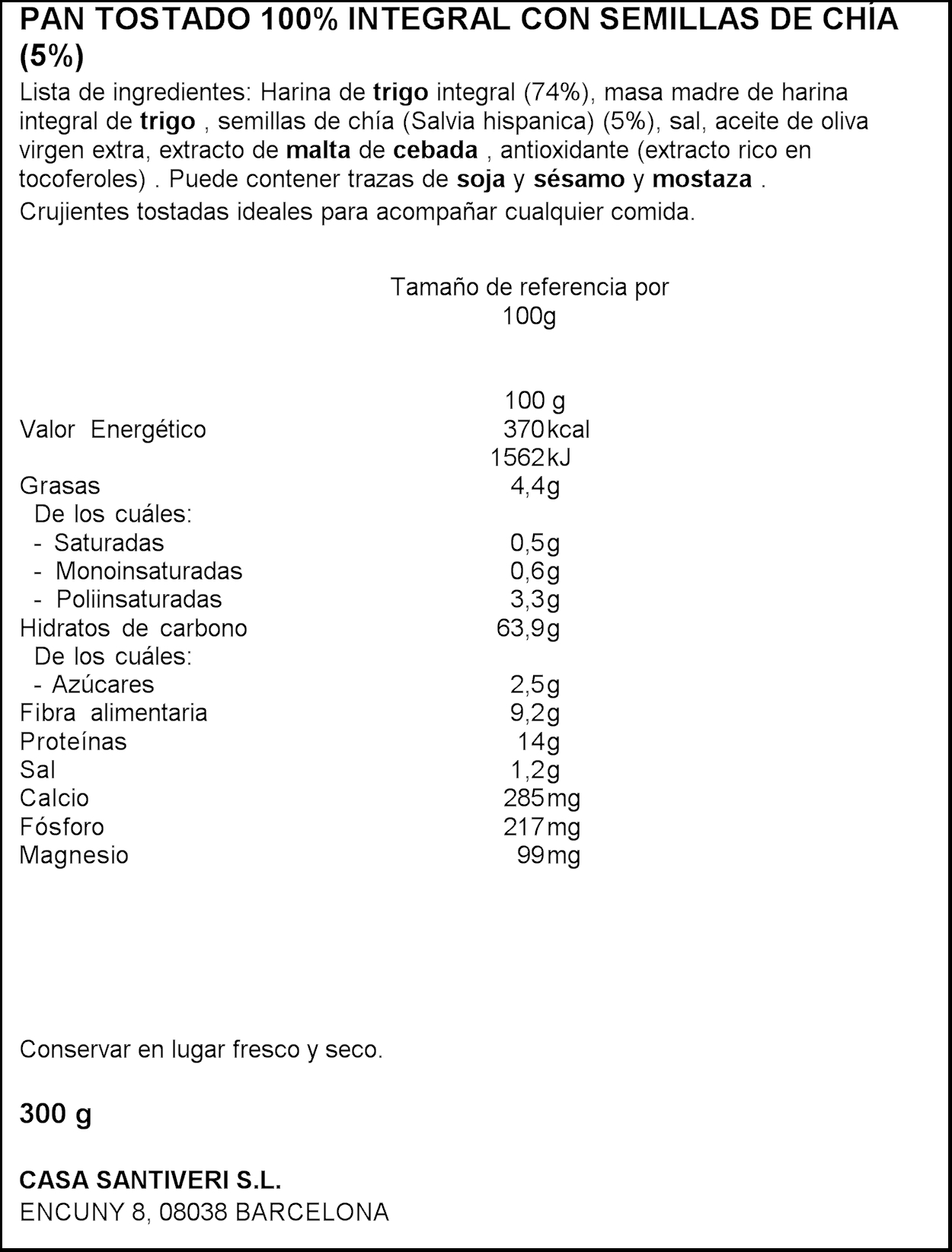 SANTIVERI PA TORRAT INTEG. AMB CHIA 300 GR