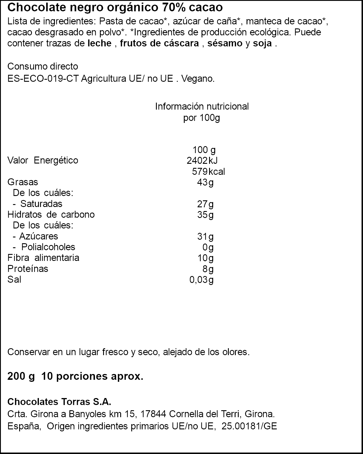 TORRAS BIO XOCOLATA PER POSTRE 70%CACAU 200GR