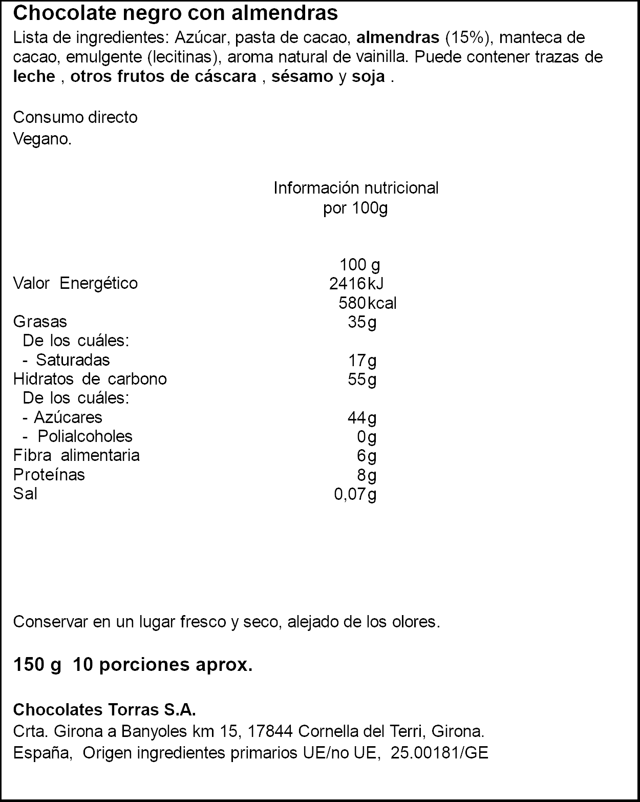 TORRAS XOCO NEGRE AMB AMETLLES 150GR